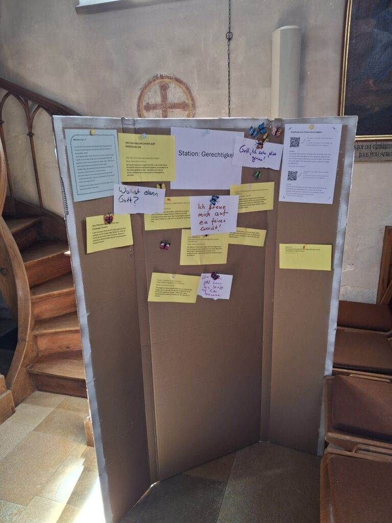 Aufbau der Station: eine Pinnwand mit einer Collage von verschiedenen Schlagzeilen und Artikeln aus aktuellen Tageszeitungen, zu beschriftende Sprechblasen, Schreib- und Bastelmaterial, Deko-Material (zur Anregung siehe Foto), Bibeltexte (s.u.) und Aufgabenblatt (s.u.).