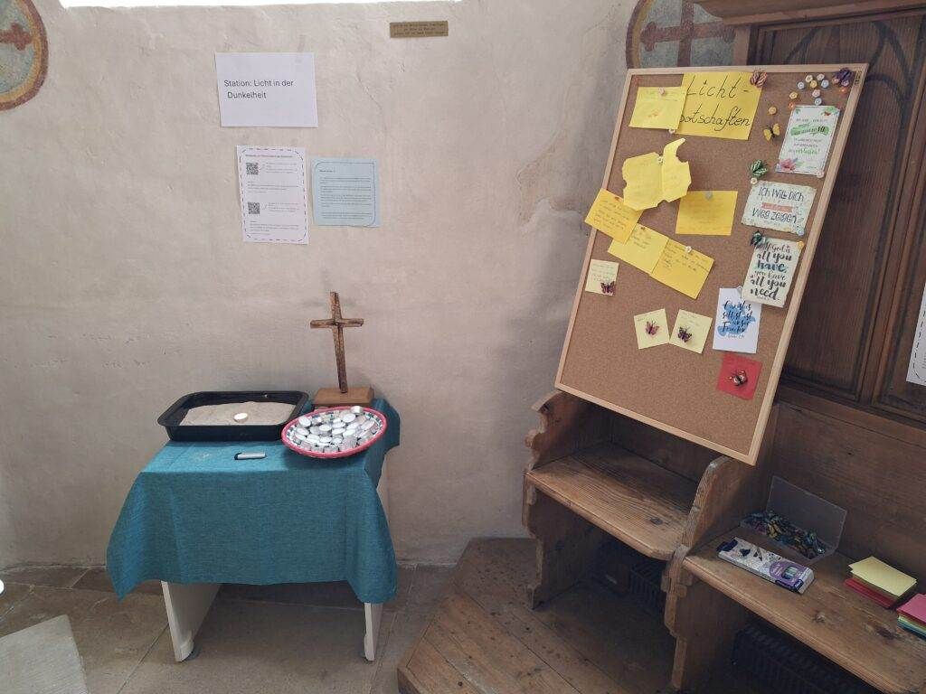 Aufbau der Station: eine Pinnwand, zu beschriftende Sprechblasen, Schreib- und Bastelmaterial, ein Korb mit Teelichtern, eine Schale mit Sand, die Osterkerze, Deko-Material (zur Anregung siehe Foto), Bibeltexte (s.u.) und Aufgabenblatt (s.u.).