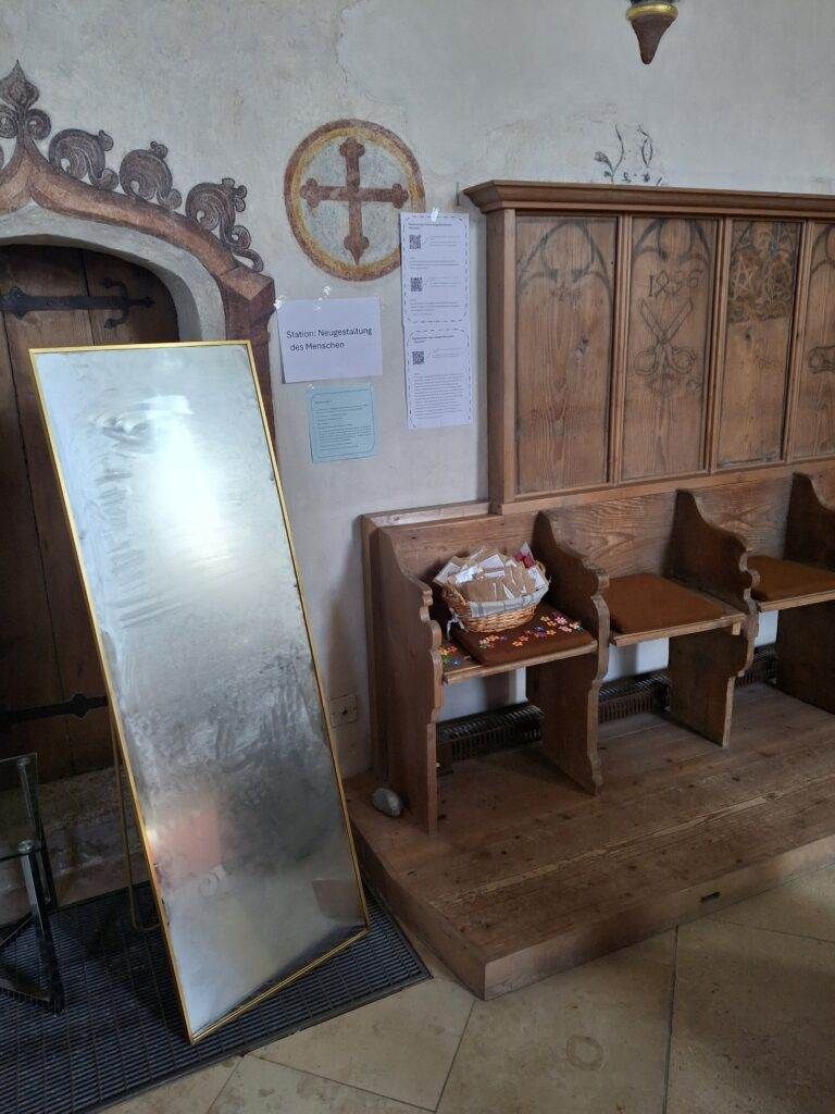 Aufbau der Station: ein großer Spiegel, ein Körbchen mit verschiedenen Samentüten, Deko-Material (zur Anregung siehe Foto), Bibeltexte (s.u.) und Aufgabenblatt (s.u.).