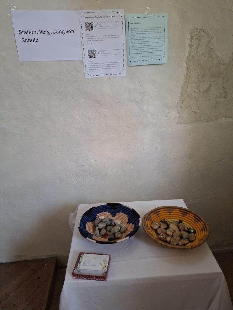 Aufbau der Station: ein Körbchen mit größeren Kieselsteinen, Goldfarbe zum Sprühen, eine Ablegemöglichkeit (z.B. Untersetzer), ein großes Kreuz, Deko-Material (zur Anregung siehe Foto), Bibeltexte (s.u.) und Aufgabenblatt (s.u.).